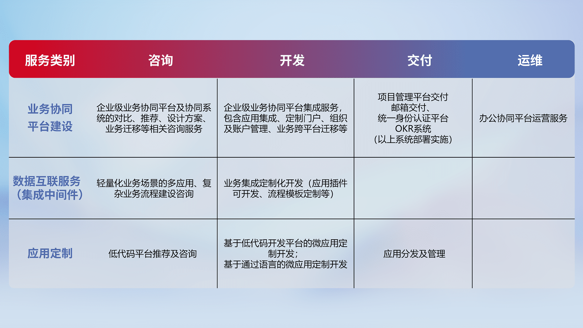 针对钉钉、、、企微、、IDaas等平台级产品提供产品的规划、、、方案、、交付、、定制化开发等服务,,,实现如统一协同办公、、智能客户服务、、、混合会议管理、、智能数据查询、、、等业务场景,,,,实现数字化转型。。。。